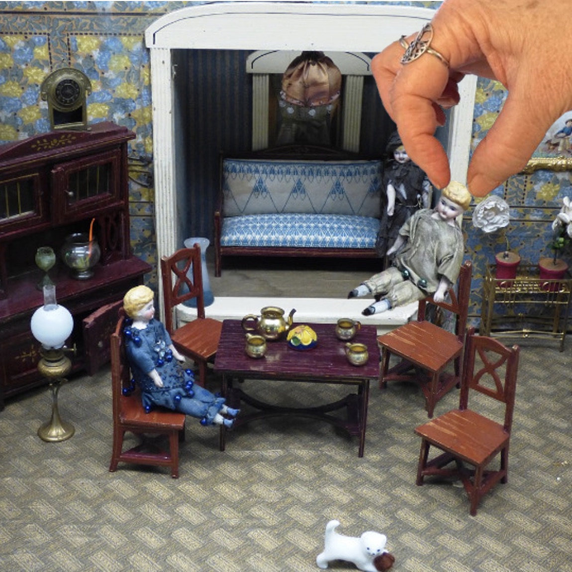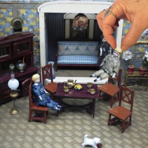 What makes showing a scene difficult are the choices: first, precisely which details to mention (or “show”), and second, how to most effectively phrase each one. For instance, from where I currently sit, I can see into my living room, which includes two windows (with different views of what’s outside), three lamps, two end tables, three chairs, a sofa, a love seat, a rug, a spinning wheel, a couple of bookshelves, and a cat tree. (Oh, and now there’s a grey cat picking a favorite sleeping spot.) Plus a bunch of clutter—cat toys, books, pictures, etc.—scattered around.